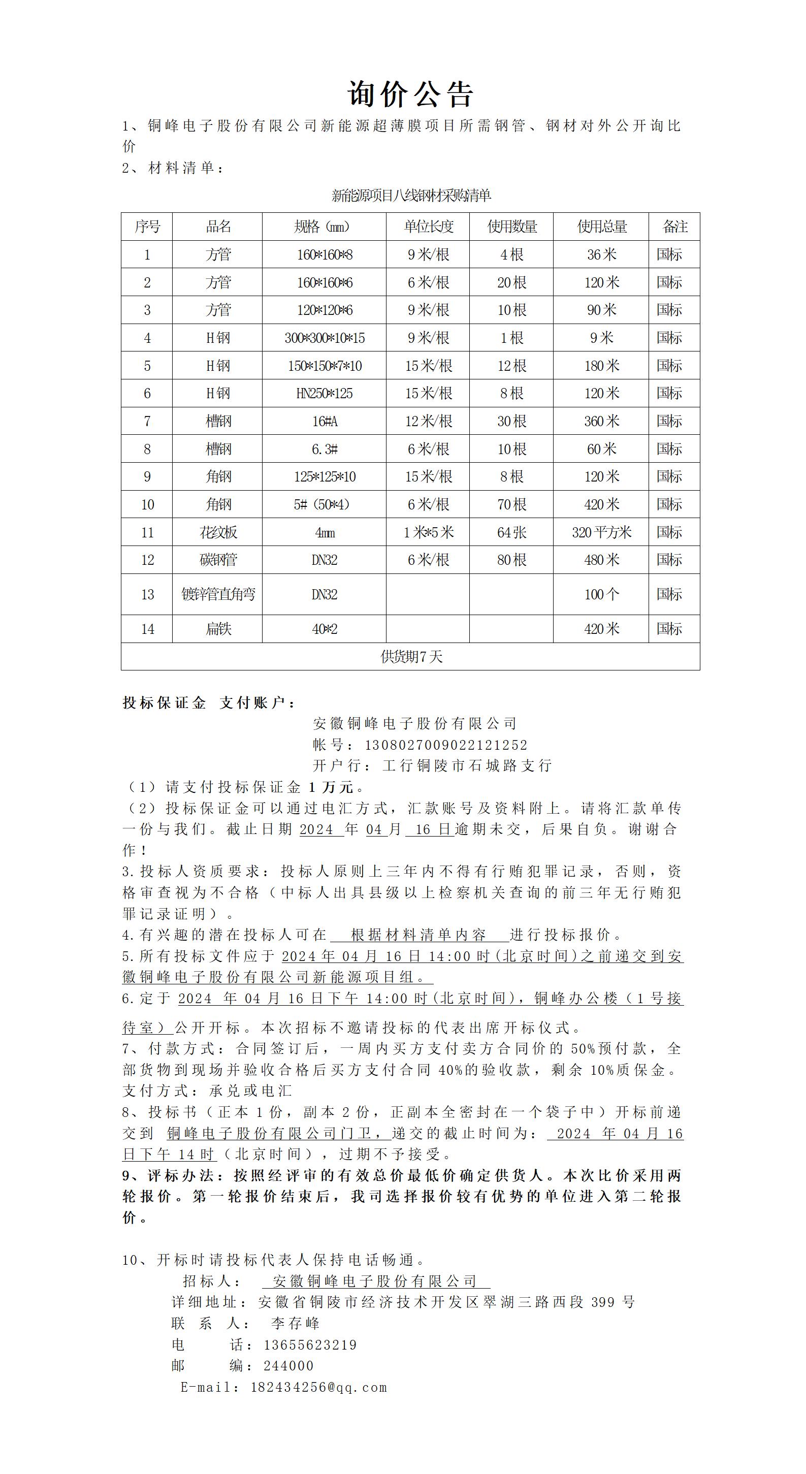 銅峰電子股份有限公司新項(xiàng)目八線鋼材詢(xún)價(jià)公告