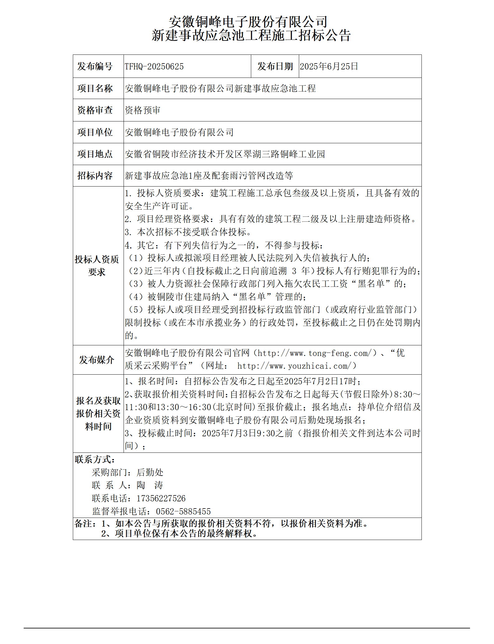 安徽銅峰電子股份有限公司 (銅峰電子事故應急水池工程招標公告)_01